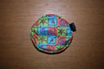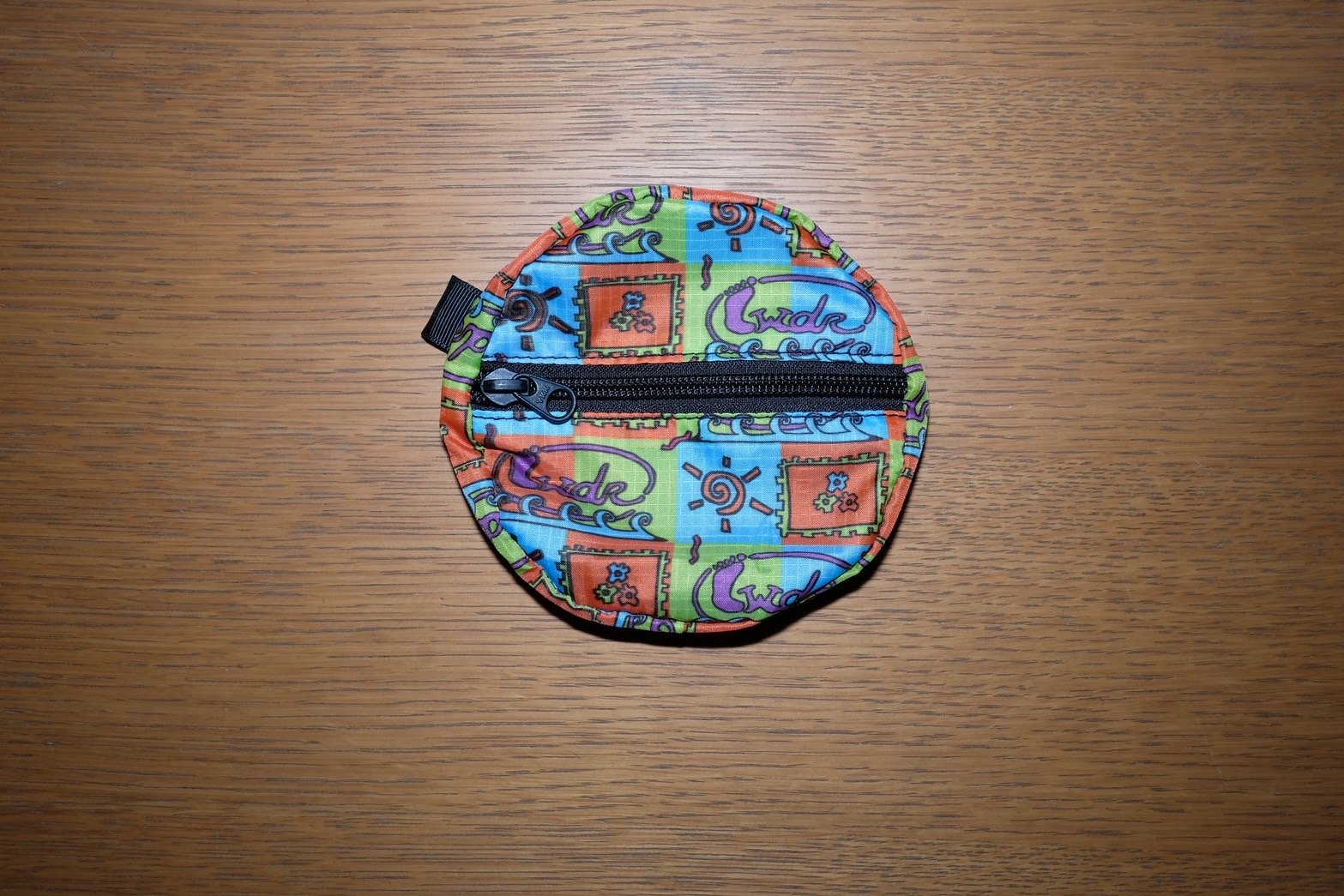 Lightweight circular pouch for your small essentials, featuring a surfy vibe print.
